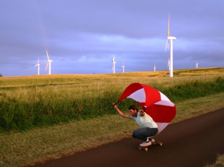 スキー、スノーボード、スケートボード、そしてサーフボードなどで何度か試したあと、弟と僕はカリフォルニア州ミルバレーのガレージで自分たちの試作品を作りはじめた。そしてこの色とりどりのカイトにスポーティング・セールという新しい名前をつけた。空気抵抗の実験をつうじて新しい自信を得た僕らは、小さいスラローム用のスケートボードを使ってさらに急な坂を試すようになった。スラローム用のボードは、従来の「一直線爆弾」のロングボードよりも反応性がいい。スポーティング・セールはトウイン・サーフィンのようにコンパクトで遊びがあるので、長い坂でさらに大きいカーブを描くことができるのだ。その過程でまったく新しいラインを描くことになる。