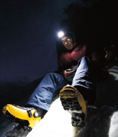 日没まであと数分というとき、僕はスキーでシール登高をはじめ、1時間後に座る場所にたどり着いた。この手のテストは夜間に実施した方がいい。なぜなら他に誰もいないから。助けが必要か、あるいは、いったいどういう訳で真冬に濡れたジャケットを着ているのか、などと聞かれることもない。風が絶え間なく吹き、ときおり突風が起こる。濡れた状態は決して快適ではないが、フィールドテストは我慢がすべて。それに、そもそもこれはアルパイン製品なんだ、スポーツウェアじゃないぜ、と自分にまくしたてた。スポーツウェアのテスターが低体温症を想定することはまずないだろう。