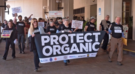 初日の昼休み、65人の農業経営者や消費者が集う「オーガニック保護集会」が開かれた。私たちはブラスバンドにつづいて行進し、広場で演説し、オーガニックの本当の意味を思い出させた。ジャクソンビルに先立った集会が他にも全国14か所で開かれたが、その日ここで起こった集会ほどすごいものはなかった。長年にわたって私たち全員を指導してきた農家エリオット・コールマンやフレッド・キアシェンマンらが行動を呼びかけ、もっと若い農家のリンレー・ディクソン、ダン・ベンソノフ、トム・バレットなども遠方から参加し、真のオーガニック農業を支援した。