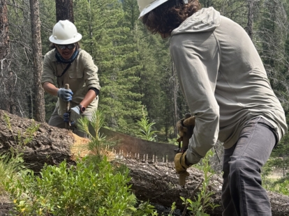 この大きなノコギリの両端を2人でつかみ、全身の力を使って木を切断していく。暑い日差しのなか、トレイルメンテナンスのクルーたちは汗をかきながら、ハイカーが安全に歩けるようにトレイルを整備している。