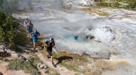 13キロのスムーズなシングルトラックを走ったあと──そして5日間でさまざまな微気候と生態系を通り抜け、環境にまつわる数々のストーリーを体験したあと──私たちは最後の丘を駆け下りた。オールド・フェイスフル・ガイザーの前に立つ数百人の群衆のなかに小走りで向かうと、オールド・フェイスフルは熱水と蒸気を30メートル以上も宙に吹き上げはじめた。数分後に噴出がおさまると、私たちはしぶしぶと通常の人間社会に戻りはじめた。だがその瞬間、私はこれら野生地の決定的な重要性を感じた。雨に遭い、風の歌を聞き、星空の下で眠り、野生動物の存在に鳥肌が立つ場所。混沌と交通渋滞と街の灯りのなかで、私たちはつねにこの野生の小さな断片を持ち歩く必要がある。自分たちの選択が、訪れるだけの遥か遠くの地に、どんな影響を与えるのかを考えるために。ランニン グやハイキングやクライミングのように、現代人の生活の因果関係もまた、一歩一歩厳密に吟味されなければならないのだ。