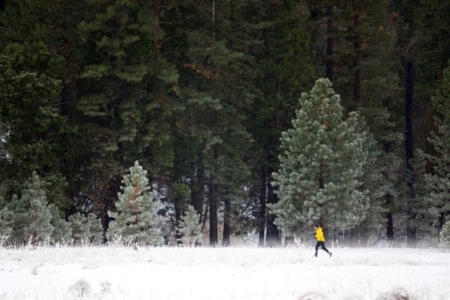 ジェームスは風に固まった雪の上をペンギンのように跳ねながら僕らをトレイルに導いた。まもなく僕らはピンクのリボンと僕らを貧弱に見せる巨大なセコイアの横にあるマイル指標を越えて進んだ。